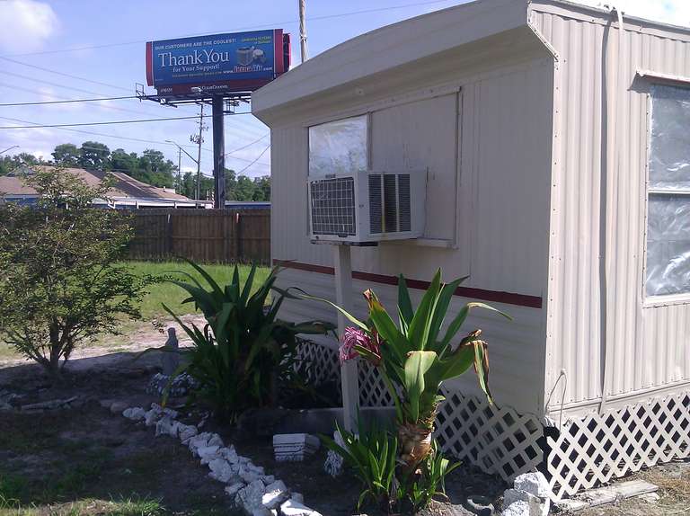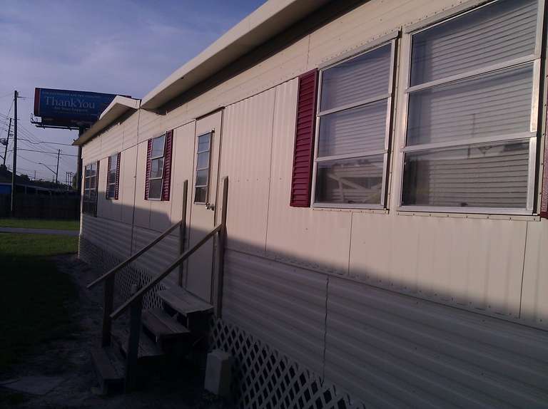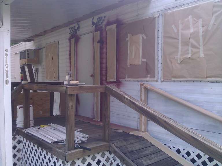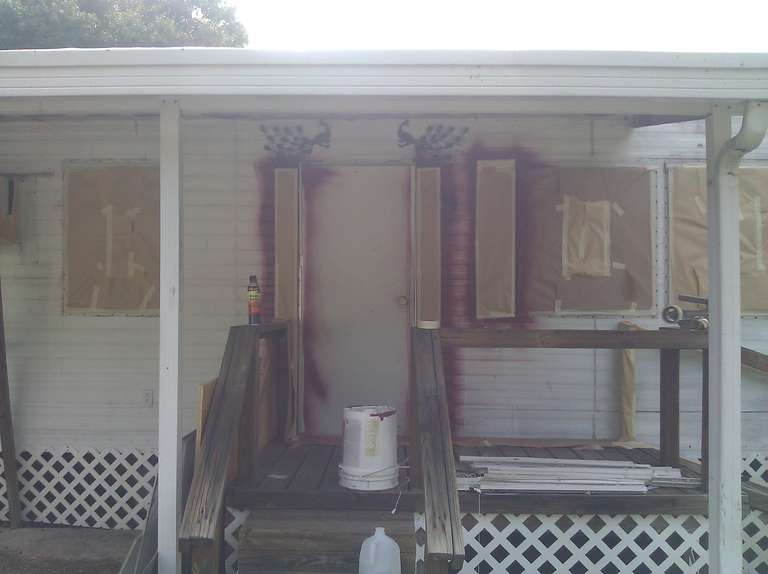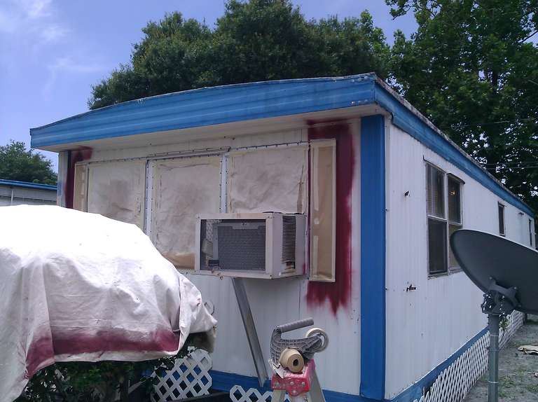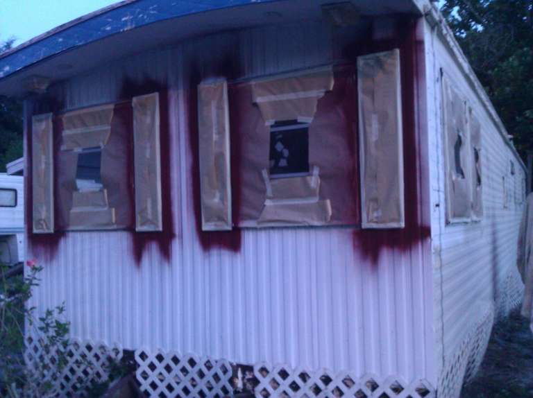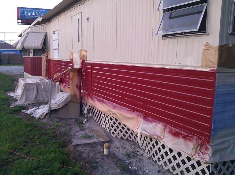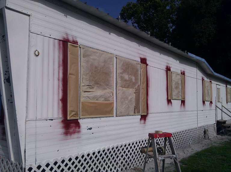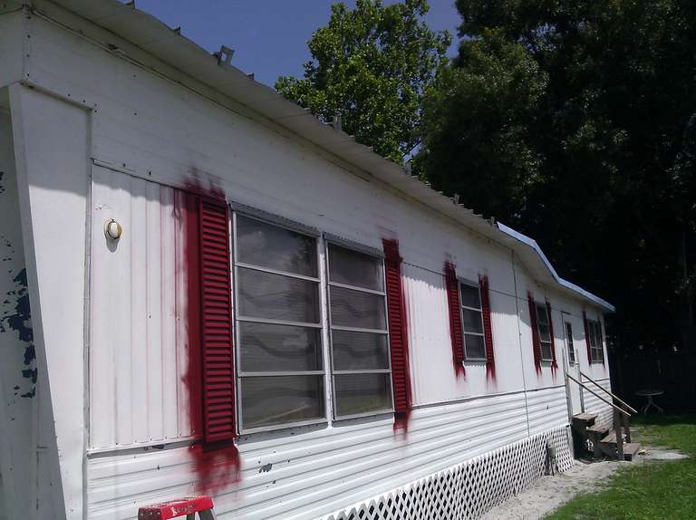 This small trailer park got a complete makeover of all the small trailer homes with two new colors. All the homes were painted with the same concept using similar sections to give a uniformity to the design for each two tone home. For a speedy production the red accents were painted first then covered up and the final color was then sprayed followed by any touch up that were needed.