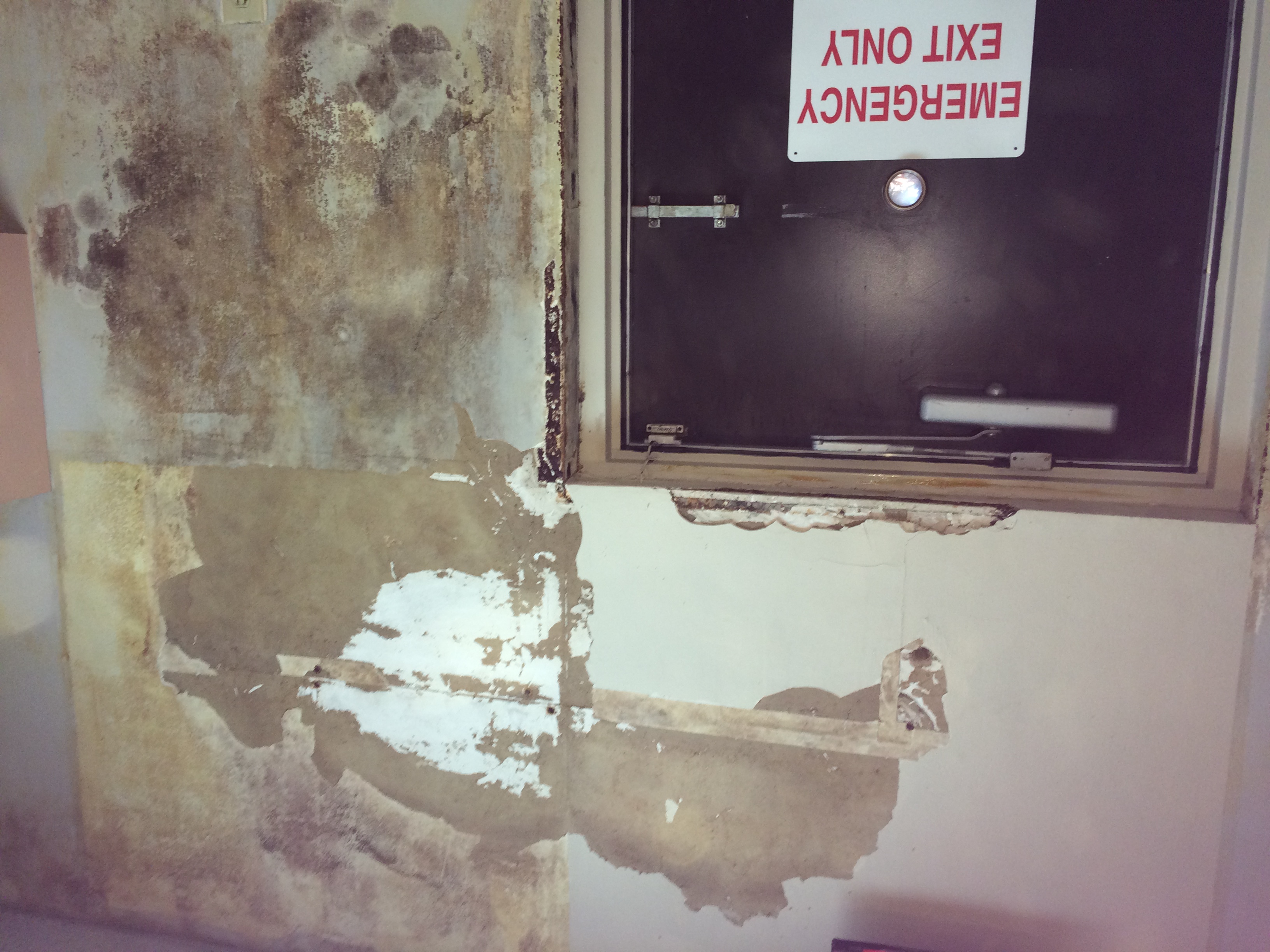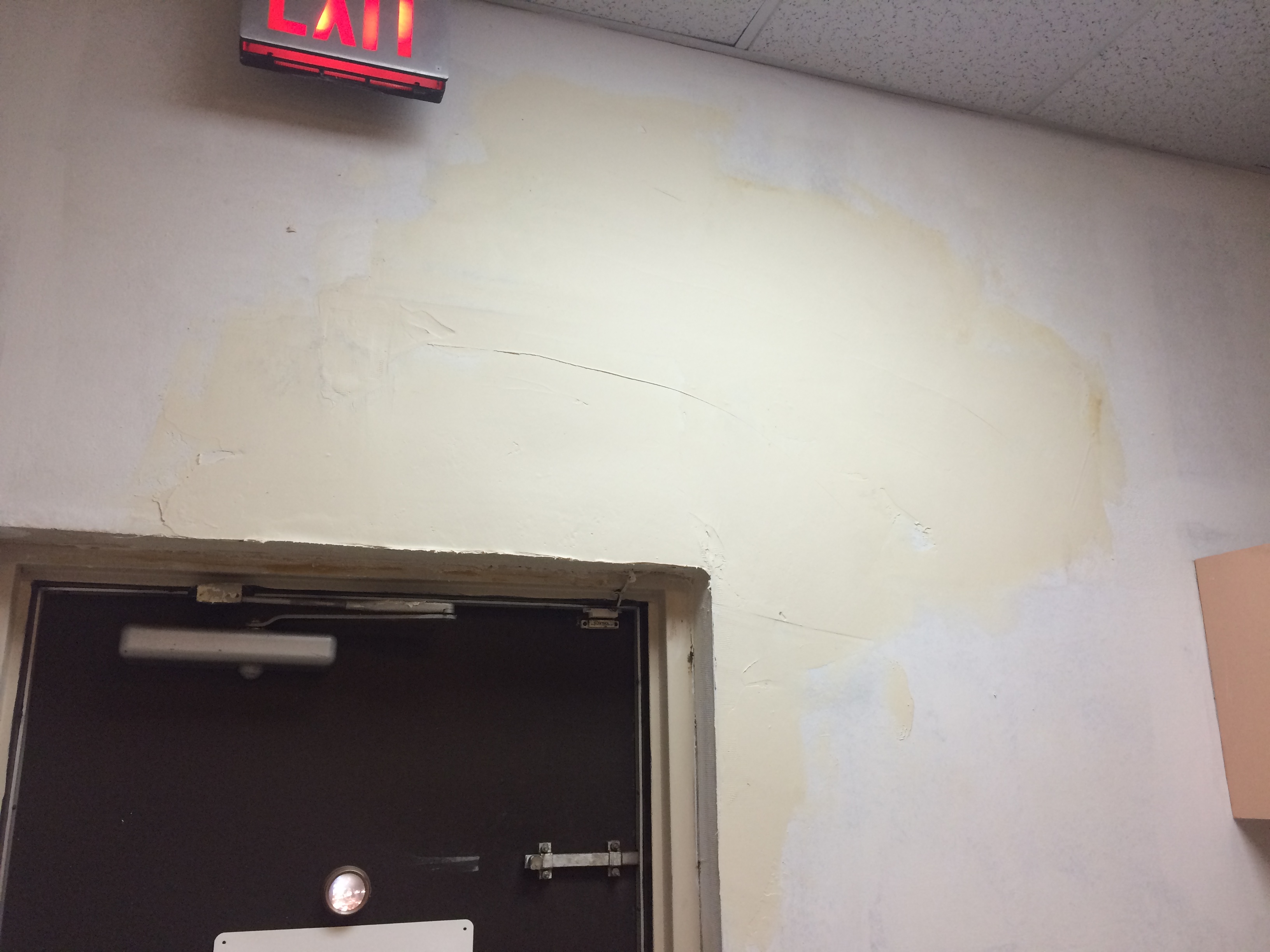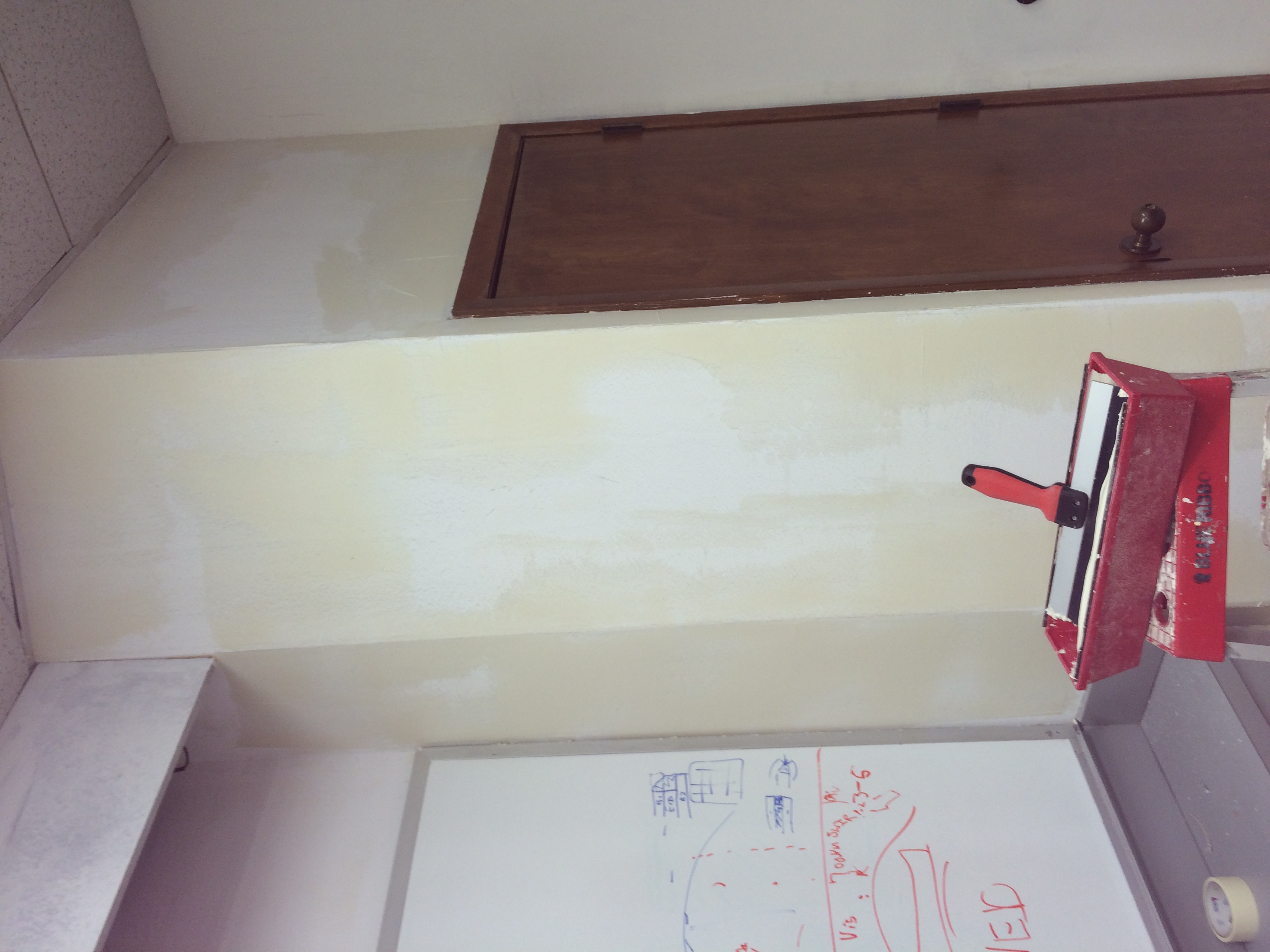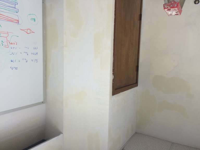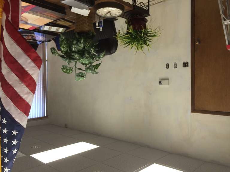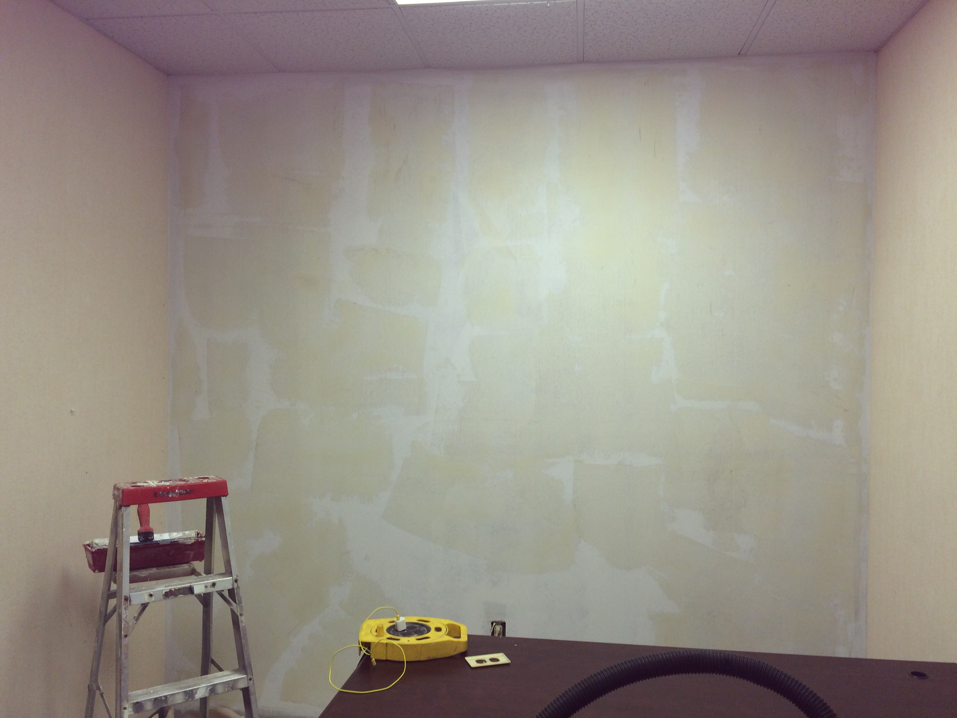 For this small business I removed the old wallpaper, then did a skim coat to even the walls out before applying a finish coat of paint. These photos are the the second phase of the process when we were doing the skim coating and some drywall repair. A few pictures of more then one step in the process as well.
